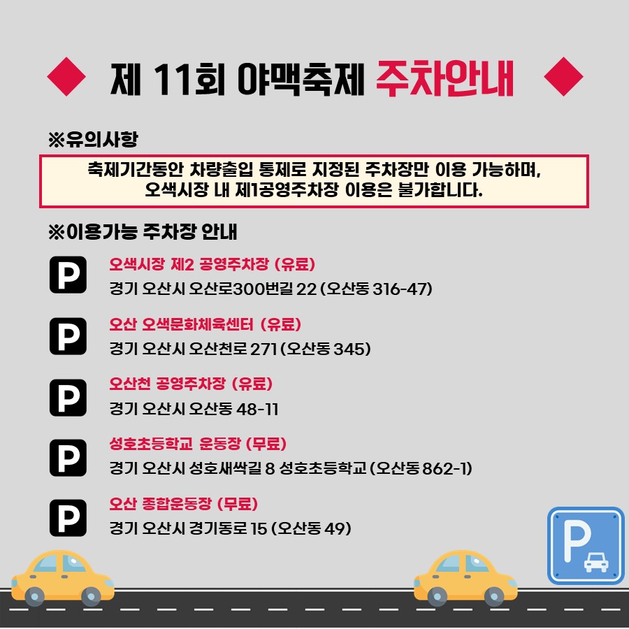 축제기간 동안은 지정된 주차장만 이용 가능하다고 하니 차량을 가지고 이동하는 분은 꼭 미리 확인하고 가시는게 좋을것 같습니다!!